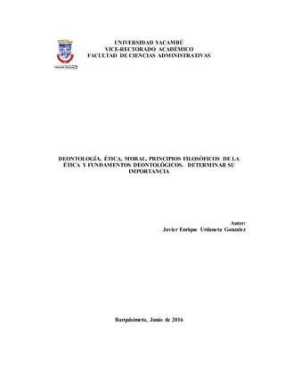 Este documento discute la importancia de la deontología, ética, moral y sus fundamentos filosóficos. Explica que la deontología estudia los fundamentos del deber y las normas morales. Se basa en principios filosóficos como la libertad y el utilitarismo. Los primeros códigos deontológicos se aplicaron después de la Segunda Guerra Mundial para regular a los profesionales. También destaca que en América Latina se han implementado códigos deontológicos y éticos, especialmente en el área