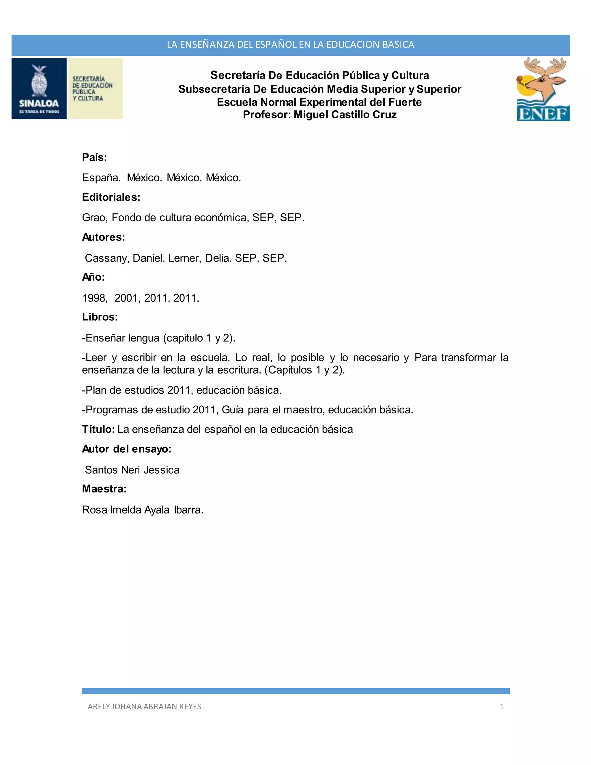 El documento describe la importancia de la enseñanza del español en la educación básica. Señala que la escuela debe preparar a los estudiantes para comunicarse efectivamente en una sociedad plural. También indica que no existe un solo modelo de enseñanza debido a la diversidad cultural, por lo que los métodos deben adaptarse a cada contexto. Finalmente, enfatiza que la escuela debe fomentar prácticas de lectura y escritura vivas para que los estudiantes puedan repensar el mundo y desarrollar su pensamiento crítico.