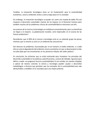 El desarrollo científico y tecnológico ha tenido un impacto significativo en la sociedad contemporánea, pero también ha contribuido a la destrucción del medio ambiente. El desarrollo sustentable busca equilibrar la protección ambiental, el crecimiento económico y el bienestar social, aunque enfrenta desafíos complejos. La innovación tecnológica puede ser tanto un motor de sostenibilidad como una fuente de problemas, y se requieren métodos más rigurosos para medir el avance hacia la sustentabilidad.