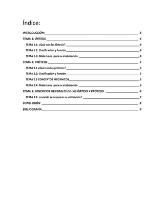 Este documento proporciona información sobre órtesis y prótesis. Explica que las órtesis son aparatos ortopédicos diseñados para ayudar a personas con pérdida o lesión de la función locomotora de manera temporal o permanente, mientras que las prótesis sustituyen extremidades perdidas de forma permanente. Describe la clasificación, funciones, materiales y beneficios de ambos dispositivos, señalando que si bien cumplen el objetivo común de recuperar o mejorar funciones perdidas, cada uno tiene