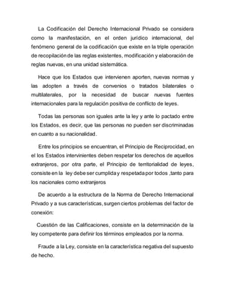 Este documento resume los principales conceptos del Derecho Internacional Privado. Explica que la codificación del derecho internacional privado busca unificar las reglas entre los estados a través de convenios. También describe los principios de igualdad ante la ley y reciprocidad entre estados. Finalmente, analiza los elementos de una norma de derecho internacional privado como el hecho, la conexión y la consecuencia jurídica.