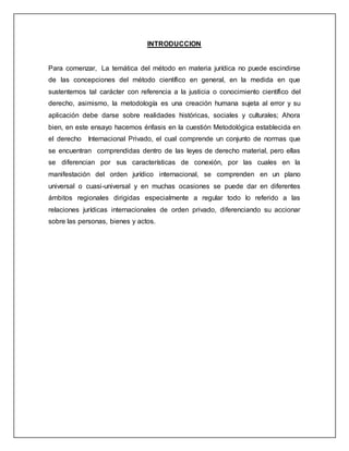 El documento discute la cuestión metodológica en el derecho internacional privado. Explica que esta rama del derecho se ocupa de asuntos legales internacionales que no son entre estados. Las normas en este derecho son distintas porque contienen un factor de conexión que involucra dos o más sistemas legales. También actúan de forma indirecta al asignar la jurisdicción aplicable basada en estos factores de conexión. Finalmente, concluye que la cuestión metodológica en este derecho se basa en una