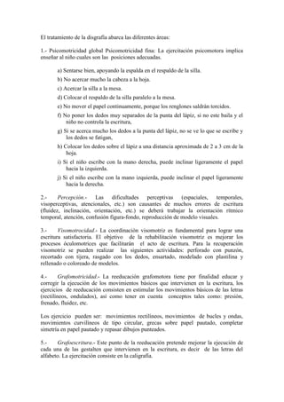 La disgrafia es un trastorno de la escritura que afecta el proceso de planificación para plasmar ideas en papel. Existen dos tipos principales: las disgrafias adquiridas como resultado de una lesión cerebral, y las disgrafias evolutivas en personas que tienen dificultades para aprender a escribir. El tratamiento de la disgrafia implica ejercicios en diversas áreas como la psicomotricidad, percepción, visomotricidad, grafomotricidad y grafoescritura para mejorar la coordinación y la