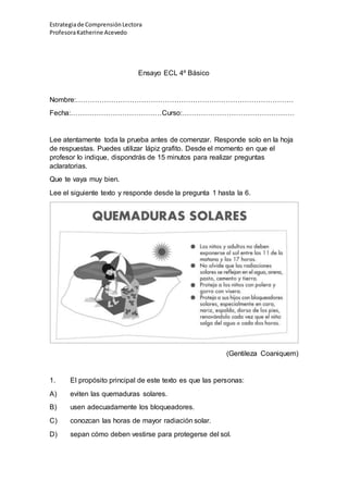 Este documento presenta un texto de comprensión lectora con 12 preguntas sobre dos pasajes. El primer pasaje trata sobre consejos para protegerse del sol, como usar bloqueador solar y evitar la exposición en horas pico. El segundo relata un accidente en bicicleta de un niño llamado Claudio y cómo descubrió otras actividades además del fútbol durante su recuperación.