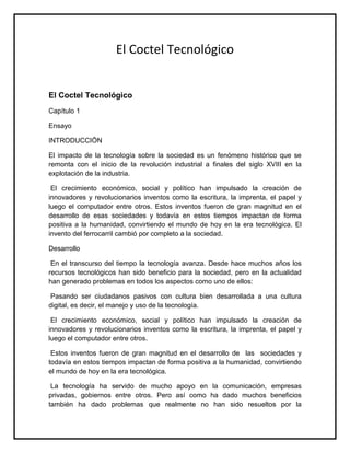 El documento discute el impacto de la tecnología en la sociedad a través de la historia. Explica que inventos como la escritura, la imprenta y el computador han impulsado el crecimiento económico, social y político y han transformado positivamente al mundo. También señala que aunque la tecnología ha traído muchos beneficios, también ha generado algunos problemas, y que depende del uso responsable que le den las personas.