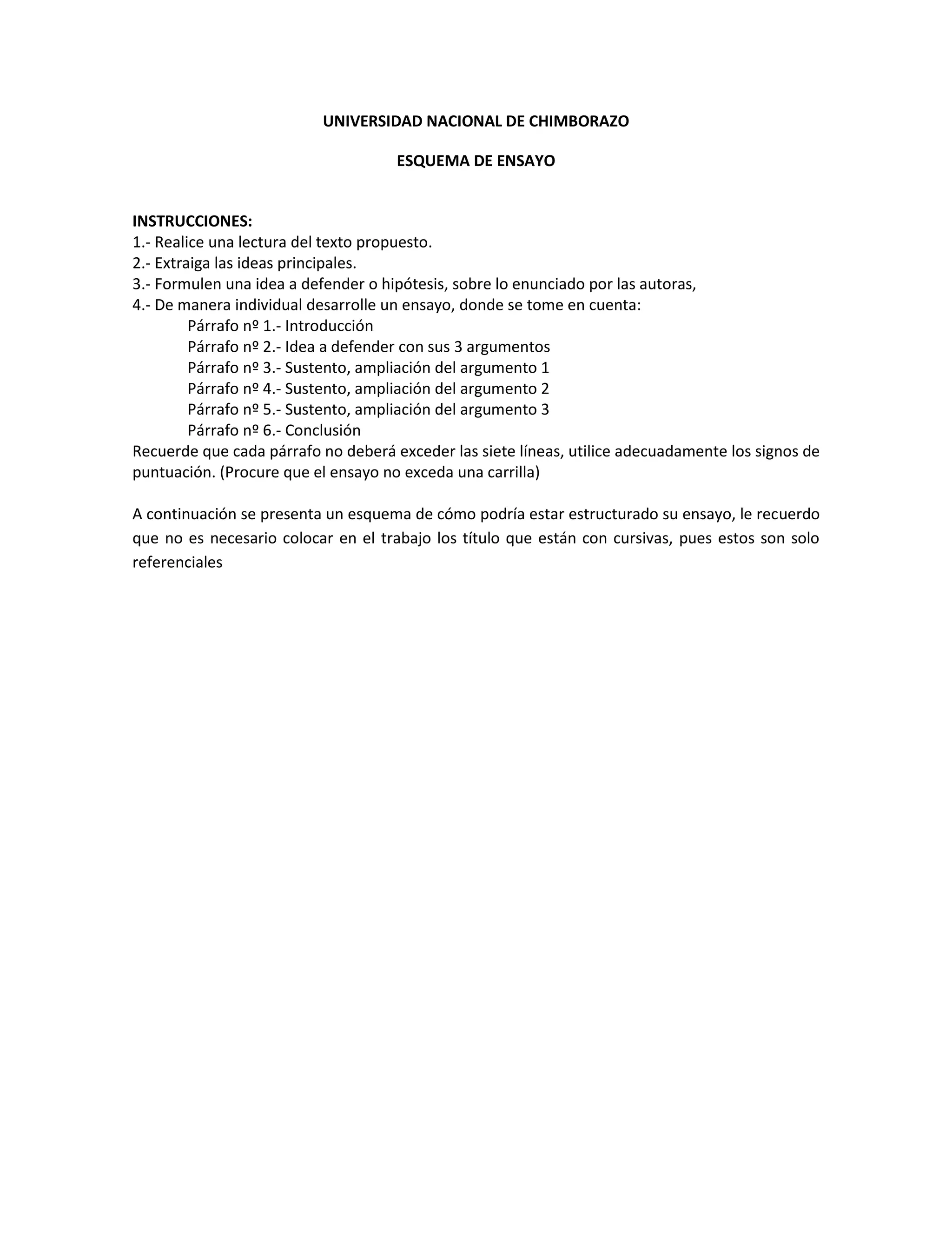 El documento presenta instrucciones para la elaboración de un ensayo, indicando que debe contener una introducción, tres argumentos a favor de una hipótesis con su respectivo sustento y una conclusión, siguiendo un esquema de entre 6 y 7 párrafos con no más de 7 líneas cada uno.