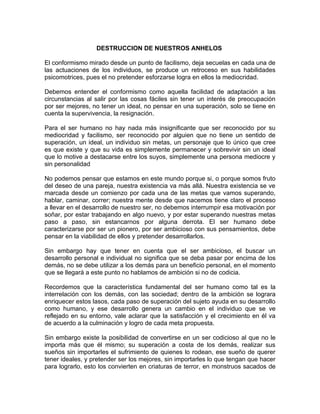 El documento discute cómo la ambición puede llevar al progreso cuando se enfoca en metas individuales y mejorar la sociedad, mientras que la codicia es destructiva cuando se persigue el poder y beneficio propio sin importar a los demás. También describe cómo los ideales de unidad e igualdad han sido socavados por la codicia de algunos líderes que buscan solo enriquecerse a costa del sufrimiento de los demás. Finalmente, argumenta que el progreso solo se logrará si todos trabajan juntos de manera ambiciosa pero considerando también