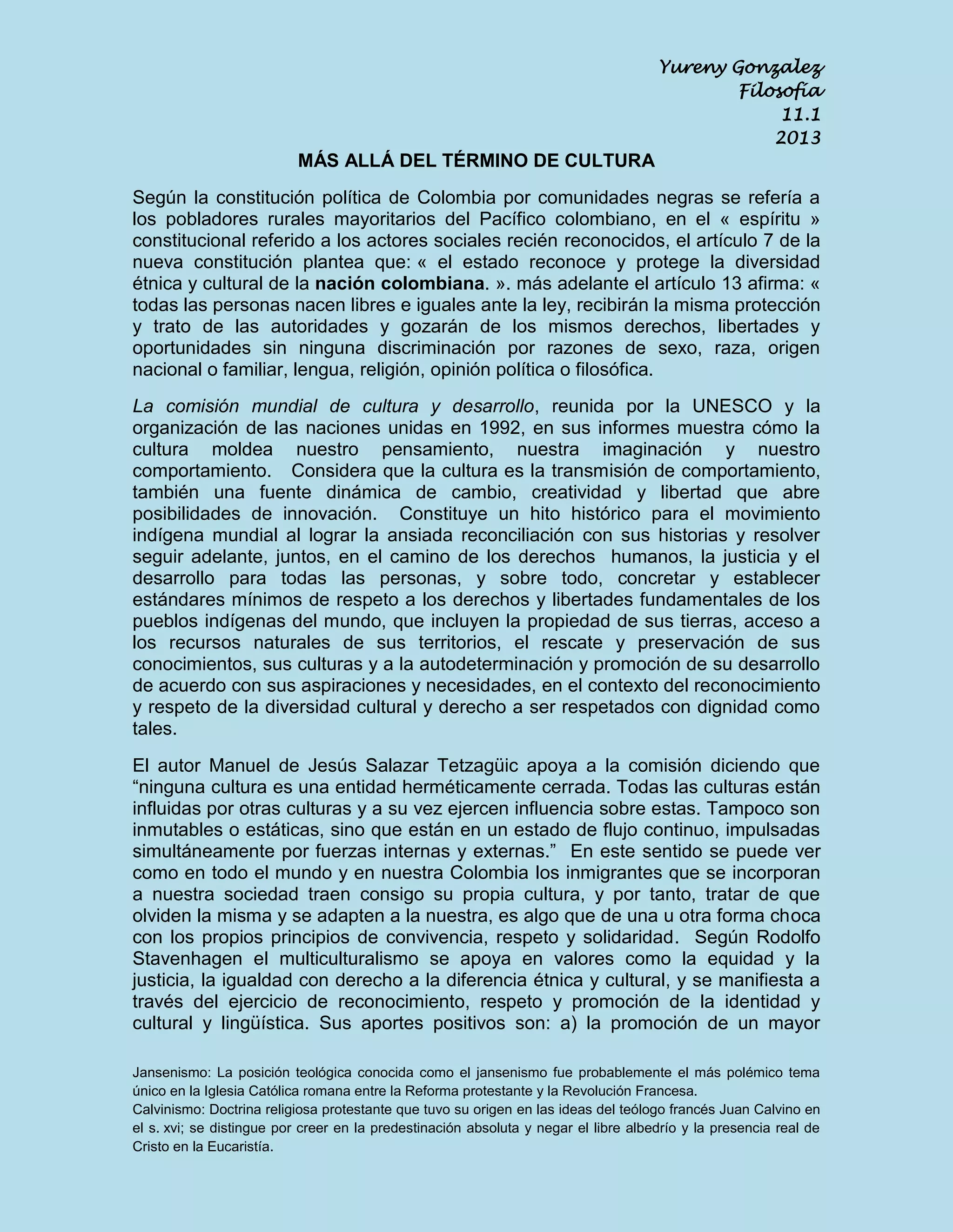 El documento discute los conceptos de cultura, multiculturalidad, interculturalidad y transculturalidad. Explica que ninguna cultura es hermética y que todas están en constante cambio e influenciadas por otras culturas. Define la interculturalidad como una comunicación entre culturas que permite el enriquecimiento mutuo a través del reconocimiento y valoración de cada cultura. Finalmente, señala que aunque la convivencia de culturas puede contribuir a la humanidad, también implica conflictos que requieren reflexión constante.