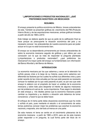 El ensayo presenta un análisis de la economía mexicana desde 1960 hasta 2010, incluyendo antecedentes históricos, gráficas sobre el crecimiento del PIB y las exportaciones, y una discusión sobre si los mexicanos prefieren productos nacionales o importaciones. El autor concluye que comprando más productos mexicanos se puede fortalecer la economía nacional y reducir la pobreza.