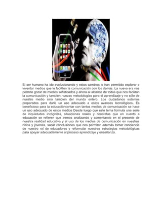 El documento describe la evolución de la comunicación humana desde los primeros pictogramas y jeroglíficos hasta las tecnologías modernas como la imprenta, el telégrafo, el teléfono y el cine. Explica que las tecnologías de la comunicación se originan de avances científicos que facilitan la comunicación, movimiento y comprensión del mundo. También destaca que en la actualidad la comunicación es necesaria e importante debido a que vivimos inmersos en una sociedad constantemente comunicada.