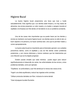 Este documento describe los beneficios de una buena higiene bucal y las enfermedades que pueden resultar de una mala higiene. Explica que una buena higiene incluye cepillarse los dientes dos veces al día, usar hilo dental, y una dieta balanceada para prevenir caries y enfermedades de las encías. También describe tratamientos como sellantes dentales para prevenir caries.