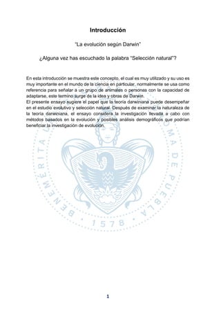 La teoría de la evolución de Darwin explica cómo la selección natural conduce a la evolución de las especies. Explica que las mutaciones beneficiosas son preservadas a través de las generaciones porque ayudan a los organismos a sobrevivir y reproducirse con más éxito. Después de muchas generaciones, esto lleva a la formación de nuevas especies adaptadas a sus entornos.