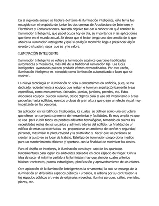 Este documento trata sobre la iluminación inteligente, que se refiere a sistemas de iluminación avanzados que pueden producir efectos automáticos y dinámicos más allá de la iluminación fija tradicional. Explora las aplicaciones de la iluminación inteligente en edificios, diseño de interiores, espacios públicos y eventos, y destaca sus beneficios como el ahorro de energía y la creación de ambientes confortables y seguros. También menciona empresas e industrias relacionadas con la iluminación int