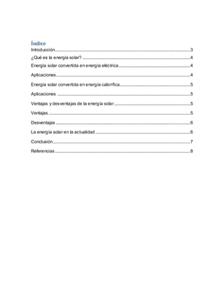 El documento aborda la energía solar, explicando su conversión en energía eléctrica y calorífica, y destacando sus aplicaciones, ventajas y desventajas. Se menciona el crecimiento del uso de la energía solar debido a su costo reducido y su potencial como fuente limpia y renovable. Además, se indican ejemplos actuales de implementación de energía solar en diferentes países, enfatizando la importancia de su uso para mitigar la contaminación y fomentar la sostenibilidad.