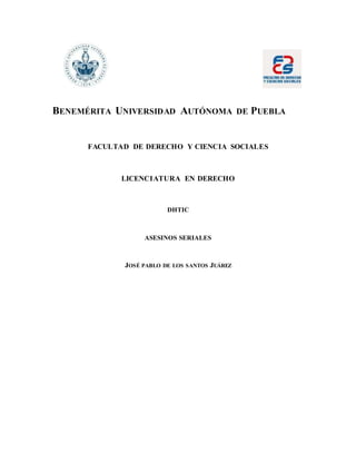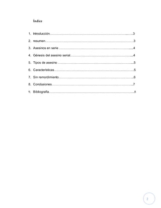 Este documento explora el origen y las características de los asesinos en serie. Explica que estos individuos son el producto de interacciones entre factores ambientales como el maltrato infantil y características personales. Identifica dos tipos de asesinos - organizados y desorganizados - basados en cómo cometen los asesinatos. Además, describe que los asesinos reaccionan de diferentes maneras después de matar, ya sea sintiendo poder o remordimiento.