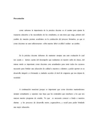 El documento discute la importancia del desarrollo humano para la práctica docente. Explica que al conocer las teorías sobre el desarrollo, los maestros pueden comprender mejor las necesidades de los estudiantes y brindar una educación más efectiva. También destaca que autores como Piaget y Vigotsky ayudan a los maestros al explicar cómo los niños aprenden a través de su desarrollo y socialización. El documento concluye resaltando la gran responsabilidad de los maestros de apoyar el óptimo desar