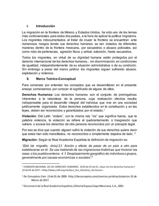 Este documento describe las violaciones a los derechos humanos que sufren los migrantes en la frontera entre México y Estados Unidos. Explica que los migrantes enfrentan abusos por parte de la policía mexicana, como agresión física, robo y extorsión. También son víctimas de la delincuencia organizada, que los secuestra y extorsiona. A pesar de los marcos legales internacionales que protegen los derechos de los migrantes, estos siguen siendo vulnerados durante su tránsito por la frontera.