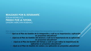 El ensayo aborda la importancia de la gestión de proyectos en el ámbito educativo, destacando la planificación, el alcance, el tiempo y los costos como componentes esenciales para garantizar el éxito. Se enfatiza que una adecuada gestión puede mejorar la calidad educativa y contribuir a un desarrollo social y económico positivo. Asimismo, se menciona la necesidad de formar al cuerpo docente para cerrar la brecha tecnológica y fomentar una educación de calidad.
