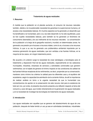El documento trata sobre el tratamiento de aguas residuales en Colombia. Explica que el aumento poblacional ha generado una mayor cantidad de aguas residuales que con frecuencia son vertidas sin tratamiento, contaminando las fuentes hídricas. Destaca la necesidad de desarrollar estrategias y tecnologías para tratar las aguas residuales de municipios, industrias y empresas, con el fin de proteger la calidad del agua. Finalmente, los objetivos son identificar los problemas relacionados con el tratamiento de aguas residuales en el país, evidenciar