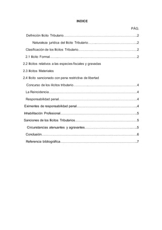 El documento aborda el concepto y clasificación de los ilícitos tributarios en Venezuela, definió ilícito tributario y su naturaleza jurídica como la violación de normas tributarias que puede acarrear sanciones por la administración tributaria. Se clasifican en ilícitos formales, materiales y aquellos sancionados con pena de prisión, y se discuten conceptos como reincidencia y responsabilidad penal. Además, se detallan las sanciones aplicables y las circunstancias que pueden atenuar o agravar dichas sanciones.