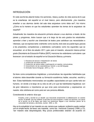 El documento describe la importancia de la enseñanza del español en la educación primaria. Explica que el objetivo es que los estudiantes desarrollen habilidades lingüísticas como leer, escribir, hablar y escuchar. También menciona estándares curriculares relacionados con procesos de lectura, producción de textos escritos y orales. El documento argumenta que la escuela debe enseñar español para preparar a los estudiantes para la vida, no solo para evaluaciones. Finalmente, enfatiza que maestros,