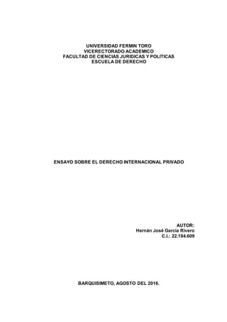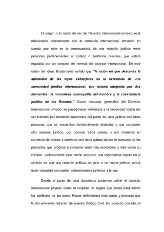 El documento resume el origen y objetivo del derecho internacional privado, el cual regula las relaciones jurídicas entre personas de diferentes Estados. Explica que su razón de ser está relacionada con el comercio internacional y la necesidad de una comunidad jurídica internacional. También describe cómo Venezuela ha participado en el desarrollo de este campo del derecho a nivel internacional y los esfuerzos de codificación tanto internos como externos.
