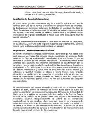 Este documento describe las relaciones entre el derecho internacional y el derecho interno. Explica las teorías dualista y monista sobre cómo estos dos sistemas jurídicos interactúan. También define el derecho internacional público, sus orígenes y funciones. Finalmente, analiza las divisiones del derecho internacional público y su fundamento.