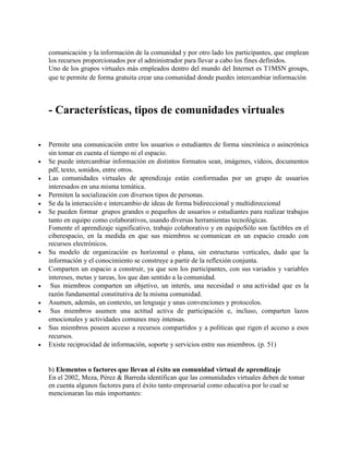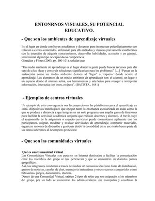 Este documento describe los ambientes de aprendizaje virtuales, sus características y potencial educativo. Explica que son entornos donde estudiantes y docentes interactúan psicológicamente para adquirir conocimientos utilizando métodos y técnicas previamente establecidas. También describe ejemplos como las plataformas de aprendizaje en línea y las comunidades virtuales, destacando que permiten la comunicación entre miembros en distintos lugares. Finalmente, analiza las ventajas de los entornos virtuales como la flexibil