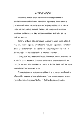 Este ensayo analiza el concepto de "brecha digital" y las estrategias para reducirla desde diferentes perspectivas. Discute las causas de la brecha digital a nivel internacional y nacional, incluyendo las diferencias socioeconómicas y de acceso a la tecnología. También examina la importancia de tener acceso a la infraestructura tecnológica, capacitación en su uso, y aplicaciones que mejoren la calidad de vida. El ensayo concluye que para reducir la brecha digital se debe enfocar en el tipo de sociedad deseada