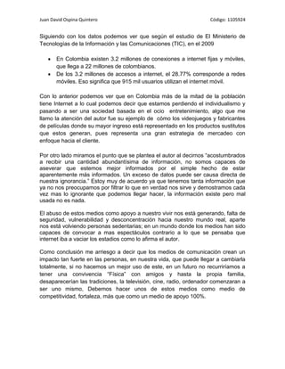 El documento resume un ensayo sobre el libro "La Red" de Juan Luis Cebrián. Explora cómo los nuevos medios de comunicación como Internet están cambiando la forma en que las personas interactúan y consumen información. Señala que en Colombia, 9 de cada 10 personas prefieren buscar productos en línea en lugar de ir a tiendas físicas, y más de la mitad de la población ahora tiene acceso a Internet. Sin embargo, también advierte que un exceso de información disponible en línea puede conducir a una mayor ignorancia ya que es difícil filtrar lo que es real