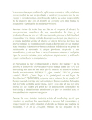 El documento habla sobre un ensayo para la asignatura de Redacción Universitaria en la Escuela de Marketing y Dirección de Empresas. Explica que el marketing va más allá de la venta y publicidad, y requiere entender las necesidades de los clientes. También describe que los estudiantes de marketing aceptan el reto de sobresalir en un mercado competitivo gracias a su formación. Por último, resalta que el marketing detecta necesidades que pueden convertirse en oportunidades de negocio.