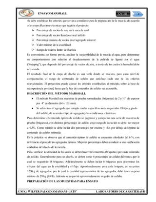 Este documento describe el método Marshall para determinar la resistencia a la deformación plástica de mezclas bituminosas utilizando el aparato Marshall. El método incluye la preparación de muestras cilíndricas con diferentes contenidos de asfalto, su compactación, y la medición de su estabilidad y fluencia usando el equipo Marshall. El objetivo es determinar el contenido óptimo de asfalto que cumpla con los criterios de resistencia, densidad y vacíos requeridos.