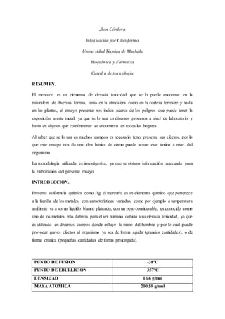 El documento trata sobre la toxicidad del mercurio. Explica que el mercurio es un metal líquido altamente tóxico que se encuentra de forma natural y se usa en diversos procesos industriales y de laboratorio. Al entrar en el cuerpo, puede dañar principalmente el sistema nervioso central y otros órganos. En caso de intoxicación, se deben tomar medidas como lavar la piel expuesta y buscar atención médica de inmediato.