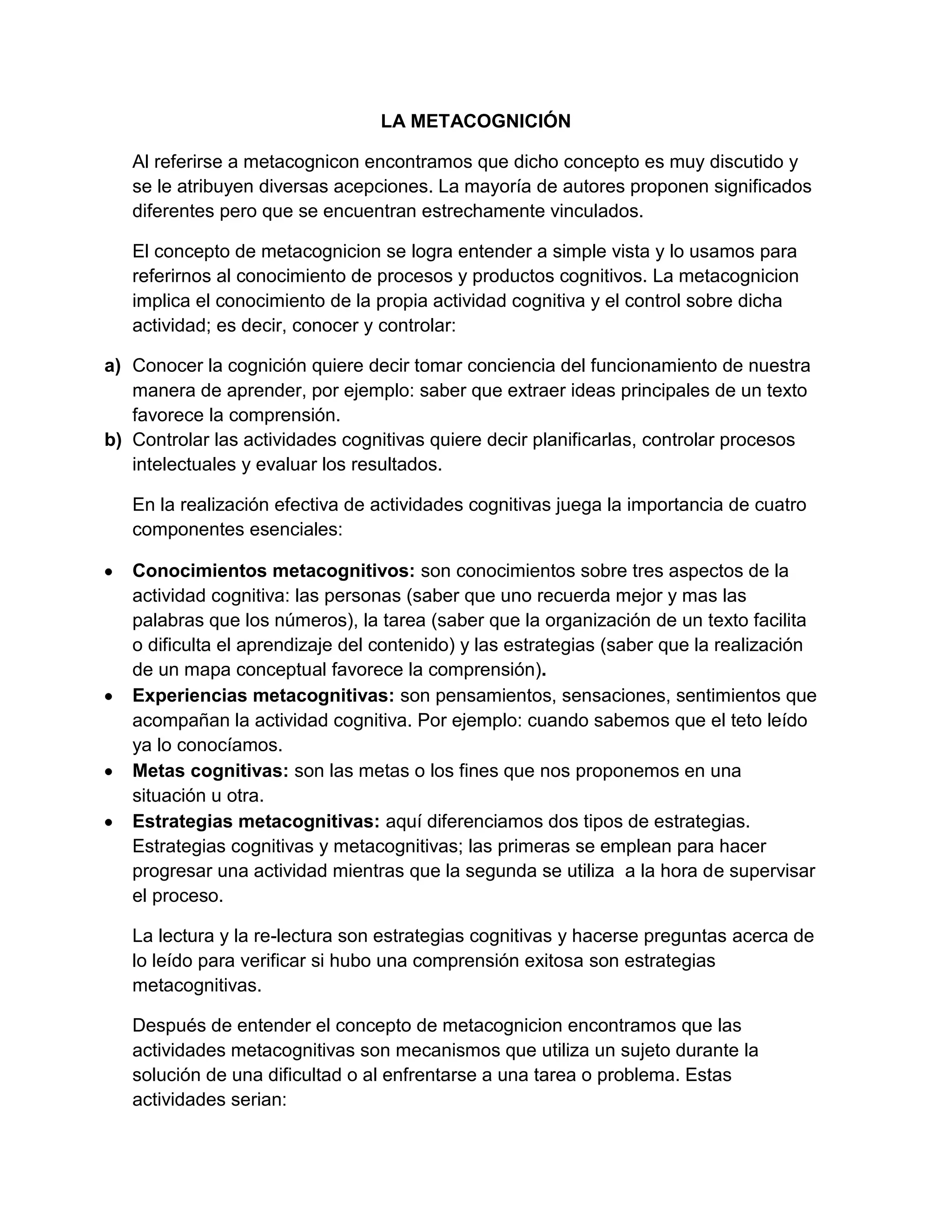 La metacognición implica el conocimiento y control de los procesos cognitivos propios. Incluye cuatro componentes: conocimientos metacognitivos sobre personas, tareas y estrategias; experiencias metacognitivas como pensamientos y sentimientos durante el aprendizaje; metas cognitivas; y estrategias metacognitivas como hacerse preguntas para verificar la comprensión. La metacognición permite estimar el tiempo de una tarea, identificar problemas y planificar su solución, y evaluar el progreso y la efectividad de las estrategias