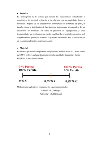 Este documento presenta un ensayo metalográfico sobre una pieza de acero F-1150. Explica que la metalografía estudia las características estructurales de los metales y cómo se relacionan con sus propiedades. Detalla el material utilizado, el procedimiento de preparación de la muestra que incluye pulido y ataque químico, y la observación microscópica para determinar las fases presentes. Finalmente, concluye resaltando la importancia de la preparación de la muestra y de la metalografía para identificar estructuras y rel