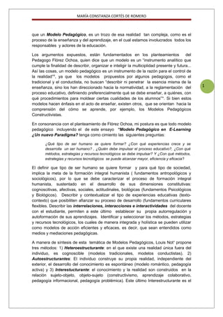 Este documento propone la construcción de un Modelo Pedagógico para el E-Learning. Explica que un modelo representa la realidad de manera esquemática y que un Modelo Pedagógico representa el proceso de enseñanza y aprendizaje. Luego define el E-Learning como una modalidad de educación a distancia mediada por tecnologías que promueve la interacción entre estudiantes, docentes y conocimiento. Finalmente, argumenta que un Modelo Pedagógico para E-Learning debe estar fundamentado teóricamente y basarse en principios como
