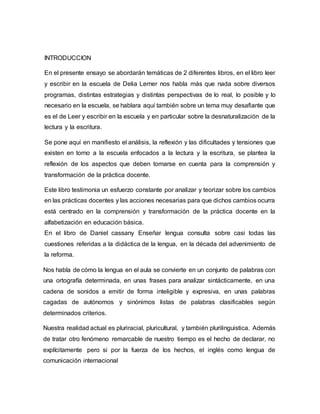 Este documento presenta resúmenes de dos libros sobre la enseñanza de la lectura y la escritura. El primer libro, de Delia Lerner, habla sobre la importancia de integrar a los estudiantes en la cultura de lo escrito y cambiar las prácticas docentes para enseñar la lectura y escritura de manera efectiva. El segundo libro, de Daniel Cassany, discute problemas en la enseñanza de la lengua y la necesidad de mejorar la formación lingüística de los maestros. También analiza la importancia de que