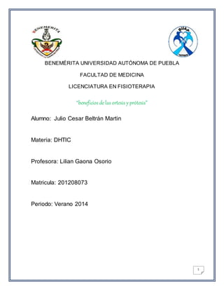 Este documento proporciona información sobre ortesis y prótesis. Explica que las ortesis son aparatos ortopédicos externos que modifican las características estructurales o funcionales del sistema musculoesquelético, mientras que las prótesis reemplazan total o parcialmente un miembro ausente o deficiente. También describe los diferentes tipos y clasificaciones de ortesis y prótesis, así como sus beneficios, que incluyen mejorar la funcionalidad, calidad de vida e integración social de quienes