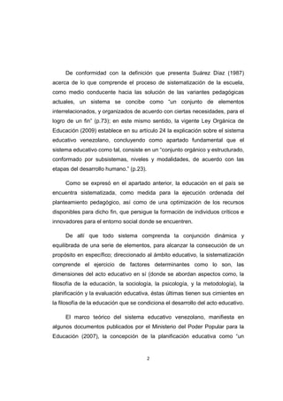 El documento describe los componentes clave de la planificación educativa como parte integral del sistema educativo. Explica que la planificación educativa implica la organización, diseño, implementación y evaluación continua de acciones educativas a través de la comunicación de objetivos, anticipación, selección de estrategias de enseñanza y aprendizaje, y la apropiación de criterios de evaluación por parte de los estudiantes. Asimismo, destaca la autorregulación de los aprendizajes como una estrategia contemporánea clave que permite a los estudiantes construir