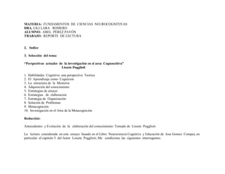 El documento resume las perspectivas actuales de la investigación en el área cognitiva. Discute cómo las teorías sobre la adquisición del conocimiento han evolucionado de verlo como una transmisión de información a verlo como un proceso de elaboración. También examina el papel de la memoria y las estrategias de aprendizaje como la resolución de problemas en la generación de conocimiento. Concluye que la educación debe centrarse menos en la transmisión de información y más en actividades que promuevan la reflexión y la elaboración del conocimiento por parte de los estudiant