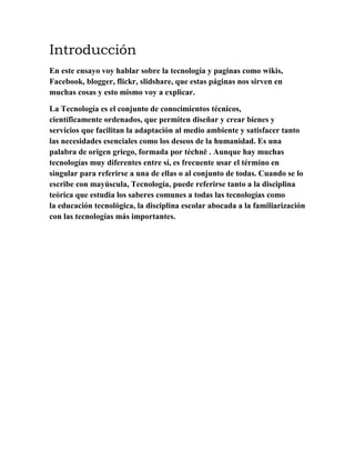 Este documento resume varias tecnologías como Facebook, Flickr, SlideShare, Blogger y Wikis. Explica cómo cada una puede usarse para comunicarse con otros, compartir fotos, publicar documentos, crear bitácoras y colaborar en documentos. Concluye que aunque estas tecnologías son útiles, también pueden aislarnos de nuestro entorno si las usamos en exceso.