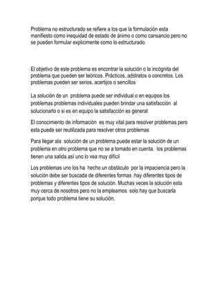 Este documento describe diferentes tipos de problemas y cómo enfrentarlos. Explica que los problemas varían en grado de dificultad y pueden ser estructurados u no estructurados. También señala que los problemas aparecen en todos los ámbitos de la vida y es importante saber cómo resolverlos de manera rápida y efectiva. Además, menciona que la solución a un problema puede estar oculta en otro problema no considerado y que, a pesar de lo difícil que parezca un problema, siempre existe una salida si se busca con diversos enfoques.