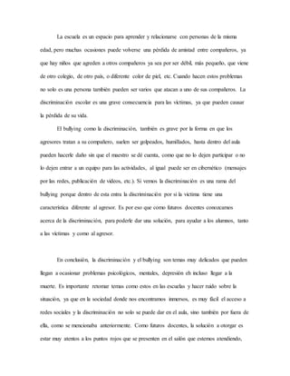 El documento describe los altos niveles de bullying y discriminación en las escuelas. Estos problemas han sido exacerbados por las redes sociales y la tecnología. Tanto el bullying como la discriminación pueden causar daños psicológicos graves e incluso la muerte. Como futuros maestros, debemos estar atentos a estos problemas entre los estudiantes y abordarlos para crear un ambiente escolar más seguro e inclusivo.
