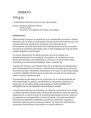 El documento trata sobre la enseñanza como un proceso evolutivo del ser humano. Explica que históricamente la enseñanza se ha centrado en los profesores como transmisores de conocimiento, pero que ahora se concibe como un proceso integrado donde los estudiantes tienen un papel protagónico. También discute cómo Vygotsky ve la enseñanza e interacción social como cruciales para el desarrollo infantil y cómo el aprendizaje escolar debe ajustarse al nivel de desarrollo del niño.