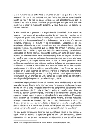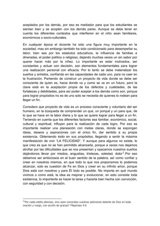 El documento discute el papel y la importancia de los docentes. Explica que un docente efectivo se compromete con la sociedad y despierta el interés de los estudiantes por aprender de manera reflexiva. También destaca la importancia de que los docentes sean guías flexibles que ayuden a los estudiantes a desarrollar nuevas ideas. El documento concluye que un docente debe construir un proyecto de vida claro para alcanzar sus metas y objetivos de manera efectiva.