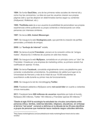 El documento describe las redes sociales, sus orígenes y evolución. Explica que las redes sociales permiten a las personas conectarse con amigos y hacer nuevas amistades para compartir intereses. Luego detalla algunas de las primeras redes como Friendster, MySpace y Facebook, y cómo estas han ido cambiando en popularidad a lo largo de los años. Finalmente, brinda detalles sobre las cinco redes sociales más populares actualmente según Alexa, incluyendo Facebook, Twitter, LinkedIn, Vkontakte y MySpace.