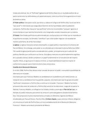 La Revolución Mexicana comenzó en 1910 como un movimiento popular contra la dictadura de Porfirio Díaz y el dominio de las élites terratenientes y el capital extranjero. Líderes como Francisco Madero, Emiliano Zapata y Pancho Villa lucharon contra Díaz y más tarde entre sí, dando lugar a décadas de conflicto que transformaron a México e impulsaron reformas como la Constitución de 1917 y la redistribución de tierras. El PRI gobernó México de 1929 en adelante, estabilizando al