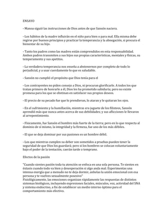 El documento analiza la vida de Sansón y los efectos de la pasión. Habla sobre cómo Manoa siguió las instrucciones de Dios antes del nacimiento de Sansón, pero que tanto él como sus padres no cumplieron el propósito de Dios para él debido a que se dejó dominar por sus pasiones. Aunque físicamente fue el hombre más fuerte, en cuanto al autocontrol y la integridad fue uno de los más débiles. También describe los efectos fisiológicos y de comportamiento que tiene la pasión en las personas.
