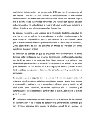Este ensayo analiza el uso de las nuevas tecnologías en la educación en México y explora el concepto de "brecha digital". Primero, distingue entre una sociedad de la información, que se centra en el consumo acrítico de datos, y una sociedad del conocimiento, que produce nuevo conocimiento. Segundo, explica que la pobreza en México es una barrera para el acceso a la tecnología y la educación. Tercero, argumenta que la brecha digital en México es alimentada por las políticas neoliberales que recortan el gasto