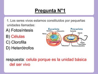 Este documento presenta las respuestas a 10 preguntas sobre conceptos biológicos y ecológicos. La primera pregunta es respondida con que la unidad básica de los seres vivos son las células. La segunda pregunta define el hábitat como el espacio que reúne las condiciones para que una especie viva y se reproduzca. La tercera pregunta identifica a la sacarosa como otro nombre para la glucosa. La cuarta pregunta define a los desechos como lo que queda después de utilizar lo mejor de algo. Las últimas preguntas cub